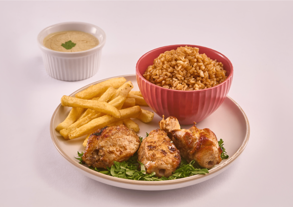 وجبه شيش طاووق تقدم مع أرز + بطاطس + نوع سلطة + عيش