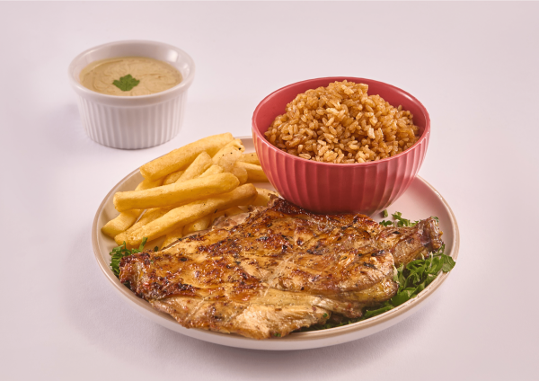 وجبة شيش طاووق مع مكرونة أو ارز + بطاطس + سلطة + عيش