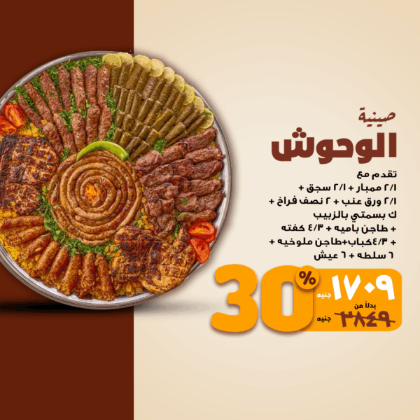 ½ ممبار + ½ سجق + ½ ورق عنب + ٢ نصف فراخ + كبسة بسمتي بالزبيب + طاجن بامية + ¾ كفتة + ¾ كباب + طاجن ملوخية + ٦ سلطات + ٦ عيش